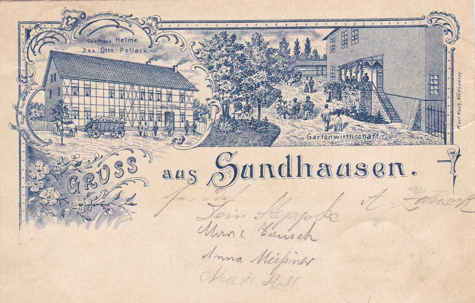 Dies ist bisher unsere älteste Ansichtskarte von Sundhausen. Otto Pollack, der damalige Inhaber der Gastwirtschaft "Zur Helme", ließ sie wahrscheinlich zu Werbezwecken drucken. Die Karte zeigt einen Stich der Gastwirtschaft von der Straßenseite, wie sie auch auf späteren Foto-Ansichtskarten zu sehen ist. Interessanterweise enthält sie auch eine Ansicht der Gartenwirtschaft mit dem Eingang zum damals noch vorhandenen großen Saalbau.