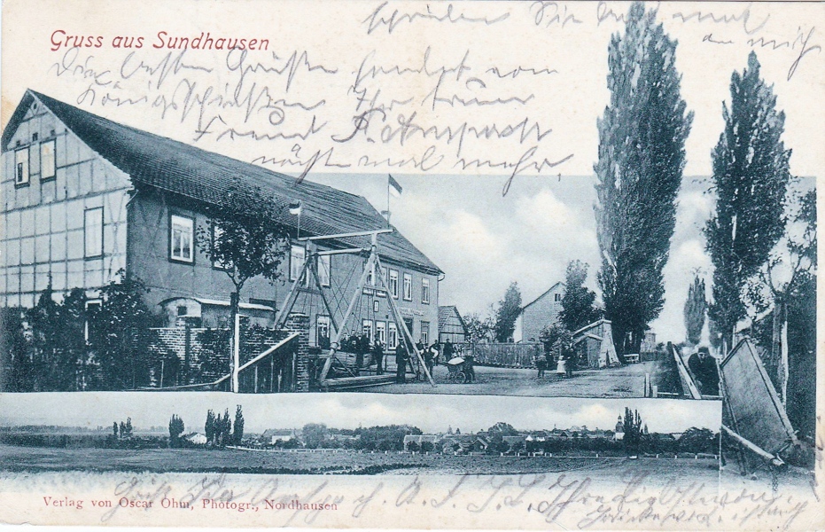Diese sehr alte fotografische Ansichtskarte der Gastwirtschaft „Zur Helme“ zeigt eine Schifferschaukel, die damals bei Festen und Feiern sehr beliebt war.