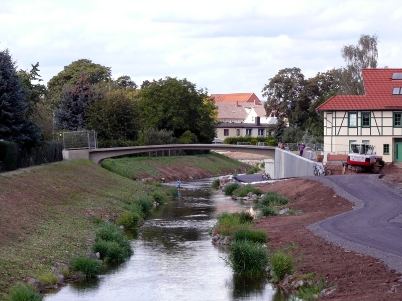 Unter der Verschalung kommt ein recht elegant aussehender Schenksteg zum Vorschein. Die Unterführung für den Radweg ist fertig, an der Rampe und dem Pegelhaus wird noch gebaut.