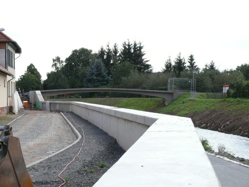 Die neue Flutmauer, im Hintergrund der fast fertiggestellte neue Schenksteg.