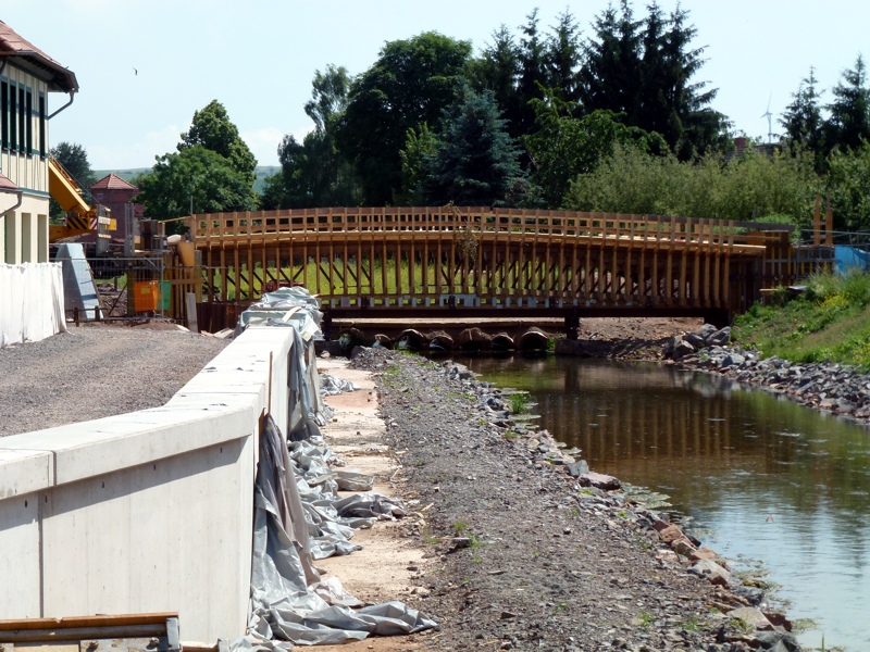 Die Behelfsbrücke mit der recht aufwendig gestalteten Schalung für die neue Brücke.