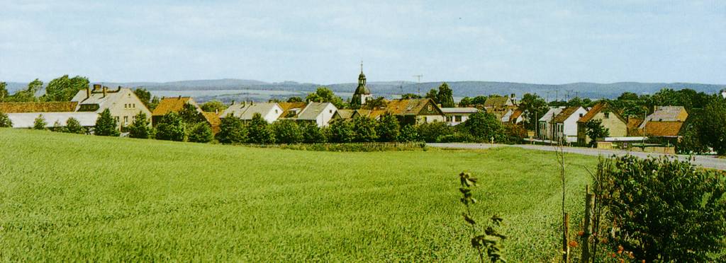 Gezeigt wird die Sondershäuser Straße, Ecke Riesleber Straße, auch „Peters Eck“ genannt, links im Bild sind die Gebäude der Saatzucht zu sehen.