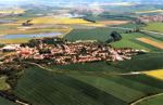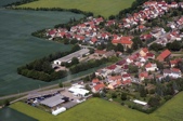 Sicht aus der Vogelperspektive auf den Ort. Hinter Sundhausen verläuft die Autobahn A38. Im Vordergrund ist die Ortsumgehung
