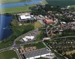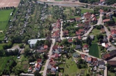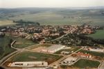 Vorn links befindet sich der Sportplatz und die Festhalle, rechts schließen sich die Gebäude der Karlsburg an. Die weißen Gebäude