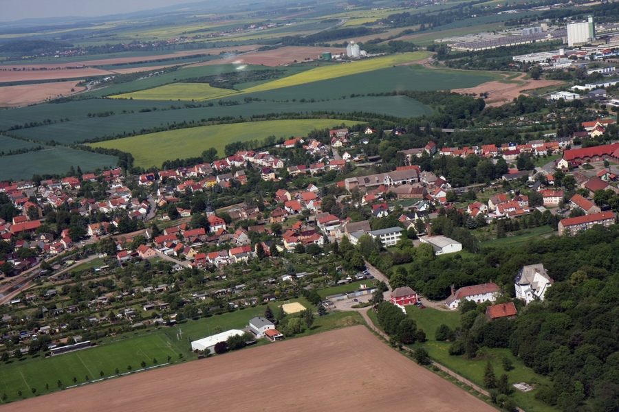 Vorn links befindet sich der Sportplatz und die Festhalle, rechts schließen sich die Gebäude der Karlsburg an. Die weißen Gebäude rechts neben der Kleingartenanlage gehören zur ehemaligen Schule. Dahinter das Schreibersche Gut.