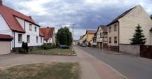 Schulstraße von Carlsburger Straße aus gesehen, vorn rechts das ehemalige Schulgebäude.