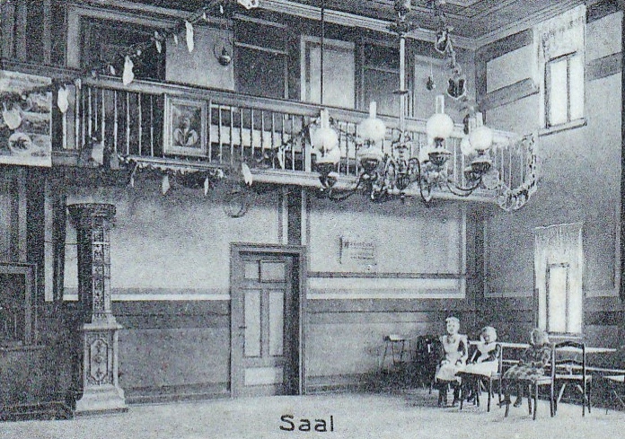 Die Innenansicht des Saals aus dem Jahr 1903, der hier noch in voller Größe zu sehen ist, gehört zur Gastwirtschaft "Zur Helme". Am Ende des Zweiten Weltkrieges wurde der Saal zerstört und nur teilweise wieder aufgebaut.