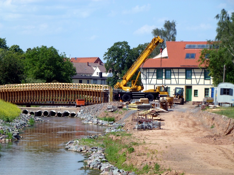 Die Bauarbeiten am Brückenkopf. Hier entstehen eine rollstuhlgerechte Rampe und das neue Pegelhäuschen von Sundhausen. Helmeregulierung 2011