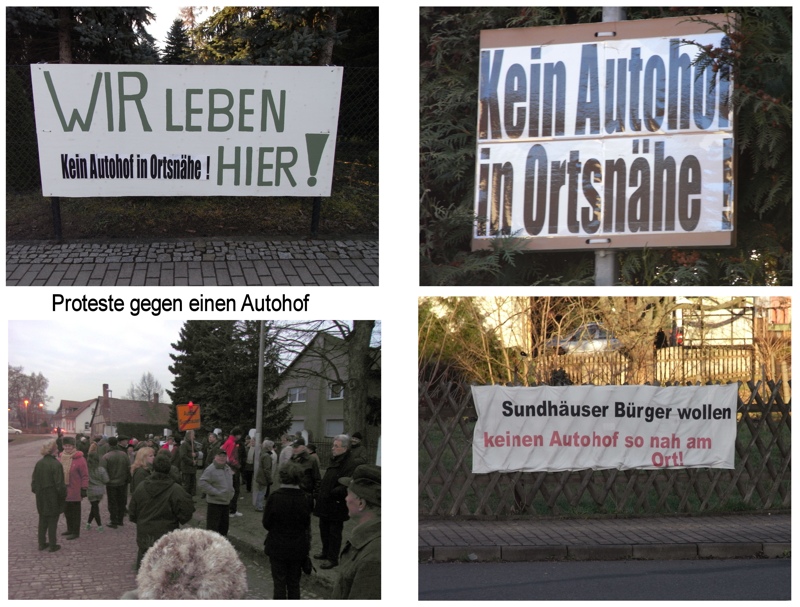 Im Jahr 2010 wollte die Stadt Nordhausen auf dem Feld zwischen Südrand der Ortslage Sundhausen und der Autobahn einen großen Autohof mit Stellplätzen für 200 LKW, Tankstelle, Hotel, Schnellgastronomie und Erotikshop errichten lassen. Die unmittelbare Nähe zur Ortschaft und die zu erwartenden Lärm-, Abgas- und Lichtemissionen wurden von den Sundhäusern scharf kritisiert. Umfangreiche Bürgerproteste über Monate hinweg konnten dieses Projekt an diesem Standort letztendlich verhindern. 2011 gab es daraufhin einen neuen Stadtratsbeschluss, der sich gegen den Autohof aussprach.